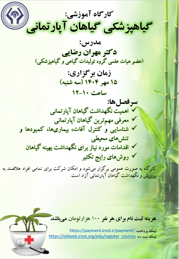 کارگاه حضوری" گیاهپزشکی گیاهان آپارتمانی " به مدت 2 ساعت با تدریس جناب آقای دکتر مهران رضایی در تاریخ 15 مهر ماه در سالن اندیشه از ساعت 12-10 برگزار می گردد.