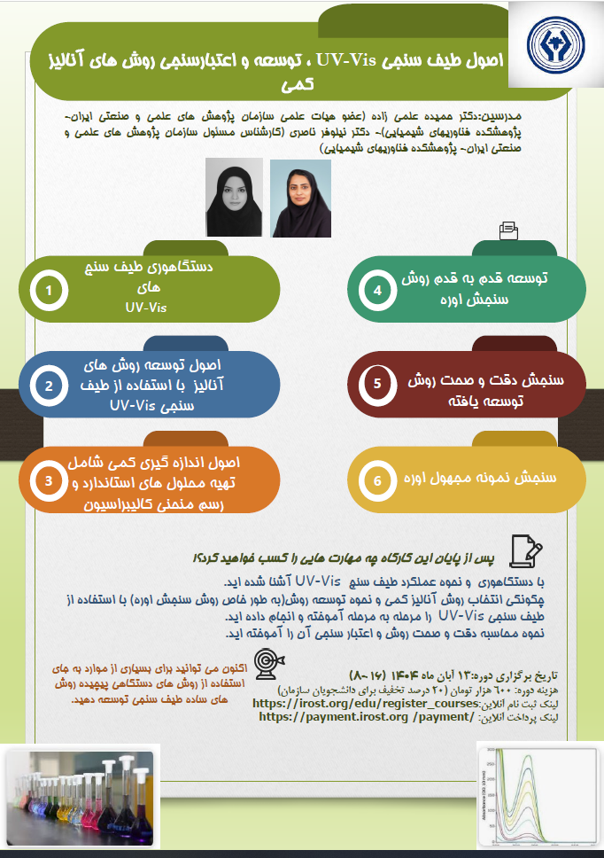 کارگاه حضوری"اﺻﻮل ﻃﯿﻒ ﺳﻨﺠی UV-Vis، ﺗﻮﺳﻌﻪ و اﻋﺘﺒﺎرسنجی روش ﻫﺎي آﻧﺎﻟﯿﺰ کمی " به مدت 8 ساعت با تدریس سرکار خانم دکترحمیده علمی زاذه و سرکار خانم دکتر نیلوفر ناصری در تاریخ 13 آبان ماه در سالن اندیشه از ساعت16-8 برگزار می گردد.