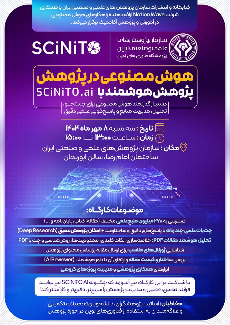 به اطلاع ميرساند كارگاه حضوري با عنوان « آشنايي با ابزار پژوهشي هوش مصنوعي Scinito » توسط جناب آقاي مهندس حسين اعظمي در روز سهشنبه مورخ 8/ 07/ 1404 از ساعت 13 الي15 در سالن ابوريحان برگزار خواهد شد.