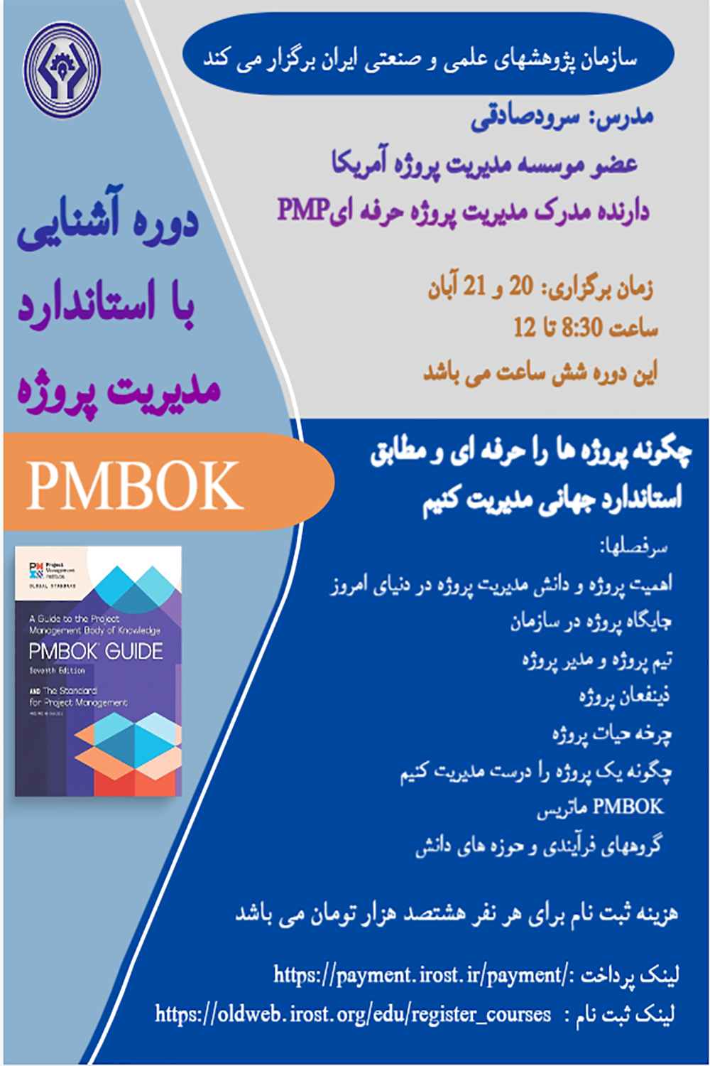 دوره " آشنایی با استاندارد مدیریت پروژه" به مدت 6 ساعت با تدریس سرکار خانم مهندس سرود صادقی در تاریخ 20 و 21 آبان ماه از ساعت 8/30 الی 12 به صورت مجازی برگزار می گردد.